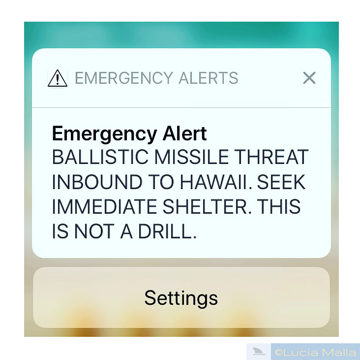Ainda estávamos acordando de manhã quando, às 8:07, meu celular e o do André tocaram o bipe de emergência. No Havaí, a Defesa Civil de Emergência tem uma ferramenta capaz de alertar para um perigo imediato o estado inteiro, por celular, rádio, TV e email. Todas as pessoas recebem a mensagem. Se o perigo for algo iminente, as sirenes tocam. Em geral, os alertas que recebemos são de inundação de chuva (flash flood) para que as pessoas evitem áreas próximas a riachos. Ou então de tsunami – já passei por dois aqui. Mas é raríssimo recebermos mensagem deles. Já que o sistema só é ativado nas emergências que podem gerar catástrofes e perdas humanas sérias.