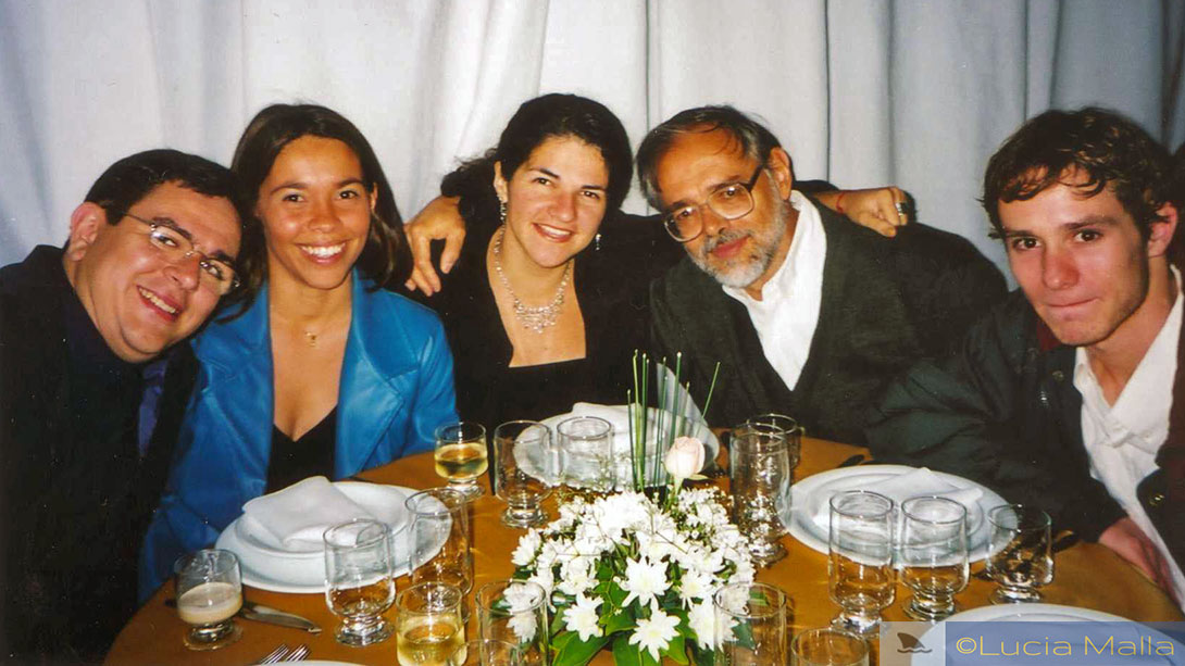 Essa foto foi tirada num casamento em Viçosa. Eu estou abraçada ao Lucio. Os 2 indivíduos da esquerda são casados, e participaram da andarilhação-roubada pelo sul da Bahia no Ano Novo/2000, que contei no post anterior. O amigo mais à direita morava na Carolina do Norte, EUA, e é um desencanado companheiro de viagens pelo MSN. E eu fico sonhando com o dia em que poderemos nos sentar de novo em volta de uma mesa, contar “causos”, dar risadas e levemente demonstrar o quanto nos orgulhamos de ter sido laboratórios (r)evolutivos do Lucio.