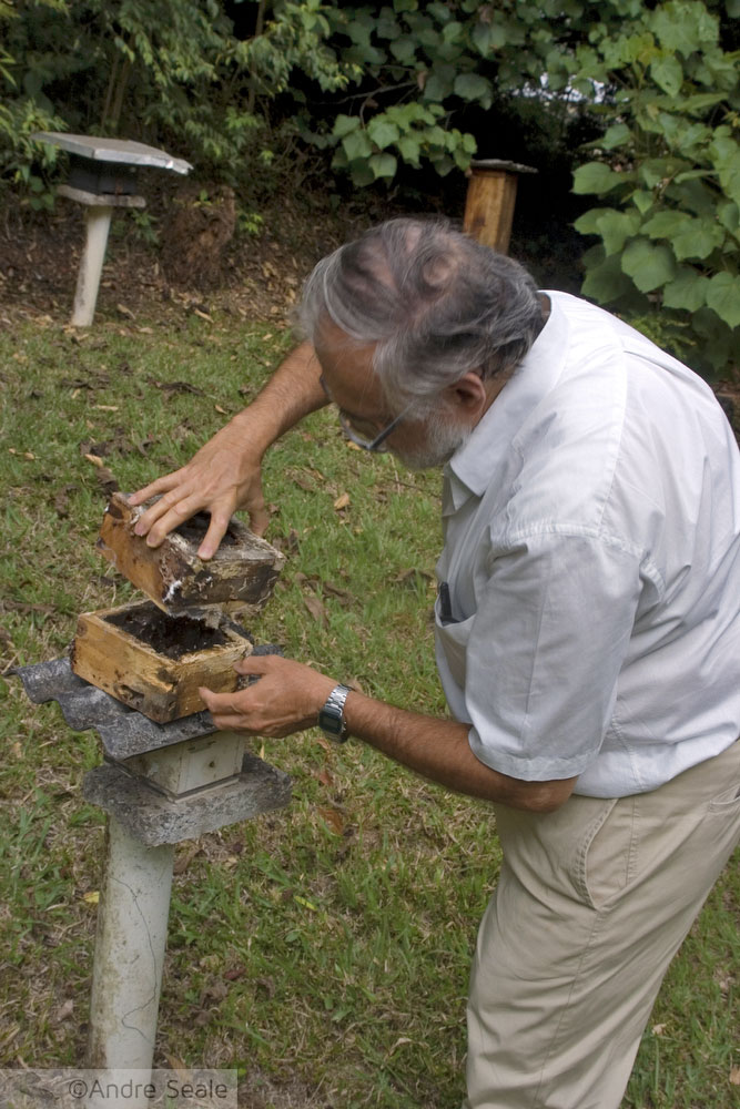Eu já estava meio ansiosa quando cheguei no quintal. Mas o Lucio, com sua simpatia, começou a abrir e mexer nas colméias – André se mostrara particularmente interessado em fotografar a arquitetura das colônias. A cada caixa, uma nova surpresa. A caixa da abelha jataí (Tetragonisca angustula) foi particularmente bem-vinda, porque seu mel era uma delícia, dos mais gostosos que já provei, e a organização dos seus favos era incrível.