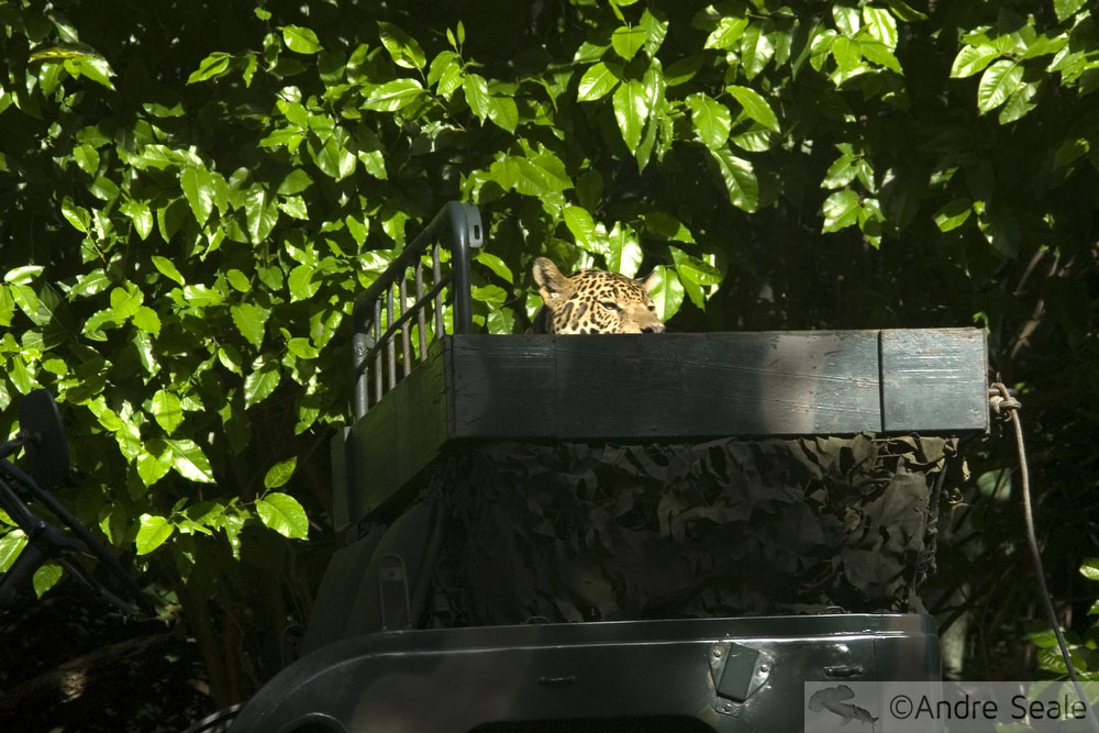 Esta onça estava fazendo as vezes de animal de estimação (ou seria arma secreta?) do batalhão militar que cuida do Parque Zoológico Municipal de Manaus (AM). Quando lá estivemos, dois soldados andavam com o “bichinho” numa coleira pelas ruas do quartel vizinho, como se fosse um cão. Depois do passeio matinal, pegaram a onça e colocaram nesse caminhãozinho, onde nós fotografamos. Achei hilário.