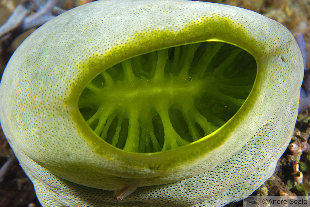 As ascídias são os vertebrados mais simples. Isso mesmo, são parentes longínquos de nós, humanos. Podem ser encontradas vivendo em colônias ou solitárias, dependendo da espécie. A da foto, Didemnum molle, é por exemplo tipicamente solitária. Seu corpo é formado por um grande saco com duas aberturas, o sifão inalatório e o sifão exalador. Este saco é por onde a água do mar passa e é filtrada. As partículas retidas passivamente servem de alimento para a ascídia. O que sobra é então expelido, ajudando na reciclagem da matéria orgânica dos recifes de corais e dos mares do mundo.