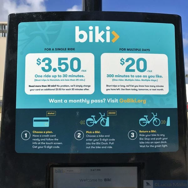 Custa US$3,50 para andar 30 minutos na Biki – e para a maior parte das distâncias em Honolulu, este tempo é mais que suficiente. Como o sistema foi elaborado para afrouxar o trânsito em Honolulu, a Biki oferece também passes mensais de US$15,00 com direito a andar quantas vezes quiser no mês (a intervalos de 30 ou 60 minutos). Outra possibilidade é pagar por 300 minutos (US$20,00) e usá-los quando quiser – é o Free Spirit Pass (amei esse nome).