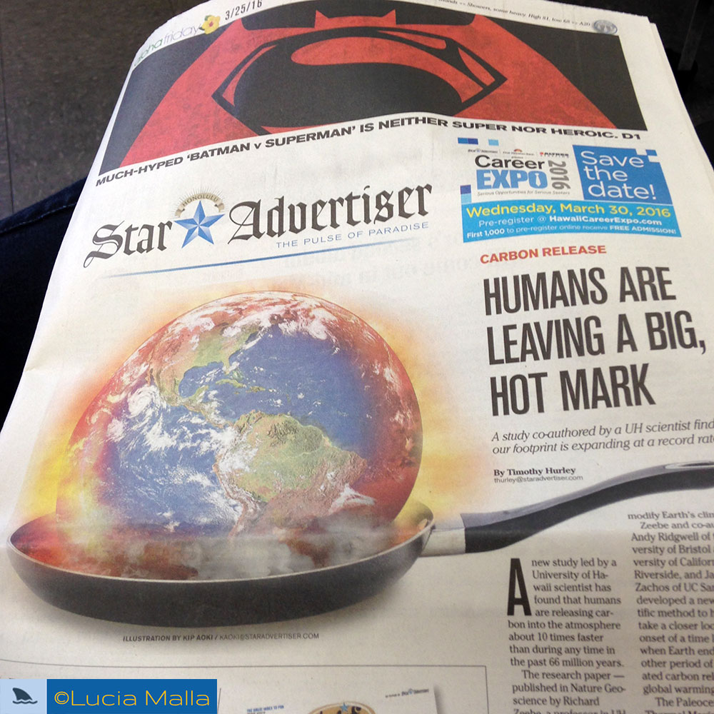 Raramente leio jornal de papel. Hoje, por estar numa sala de espera com uma pilha de jornais, terminei pegando um deles para passar o tempo. E lá estava estampada na primeira página do jornal local uma notícia que deveria estar todos os dias na primeira página, sendo martelada com barulho. Era sobre a urgência com que as mudanças climáticas causadas pelos nossos hábitos estão afetando o mundo atual. Mais: como, dado que não mudamos nosso paradigma sócio-econômico-ambiental, o point of no return está cada dia mais próximo. A capa era essa abaixo.