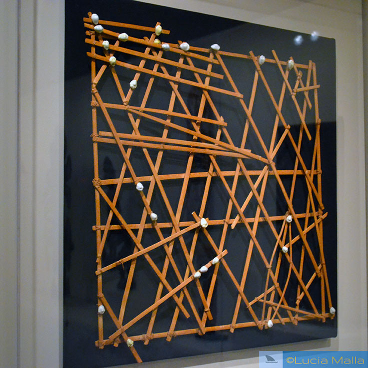 Carta náutica originária das Ilhas Marshall constituída em conchas, que representam as ilhas e varas de bambu que representam as correntes marítimas. (Em exibição no Museu de Belas Artes de Boston)