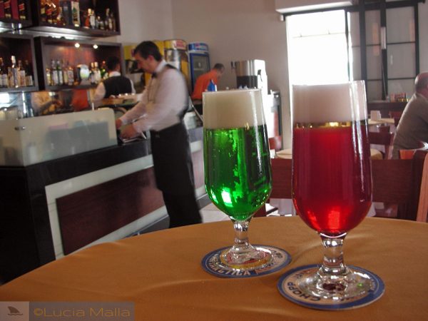 Enfim. Enquanto comíamos uma pizza de muçarela no bar, saboreamos um delicioso chop de groselha e outro de menta, esses sem maiores problemas grafológicos. Eu adoro chopes com sabor. Acho que são as cores desses líquidos que me fascinam, porque trazem essa sensação de domingo à tarde tranquilo, com boas expectativas de uma semana melhor por vir. Um tintin colorido a todos, então.
