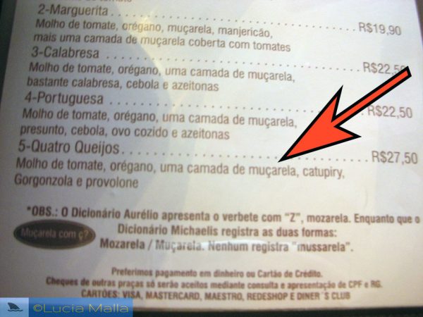 É claro, eu não devo ter sido a única a se incomodar com essa grafia, porque logo abaixo dessa mesma seção no cardápio havia o recado explicativo visto no rodapé da foto acima, dizendo que o dicionário Michaelis registra a grafia muçarela ou mozarela, e não mussarela.
