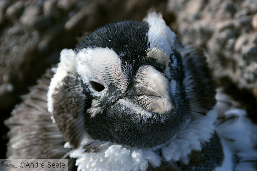 Um pingüim de Magalhães em pose. A penugem sendo trocada faz parecer que ele está com um gorrinho andino.