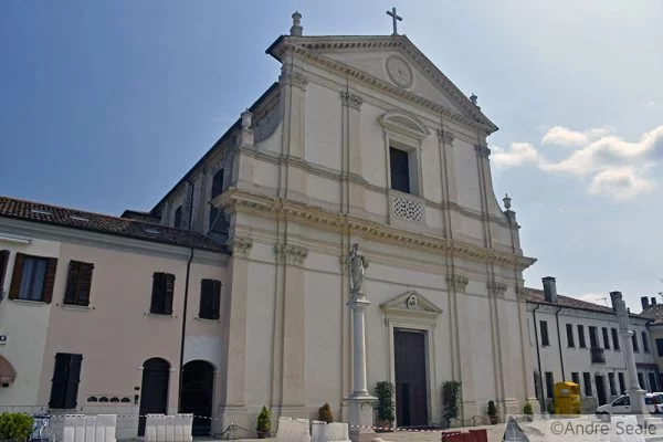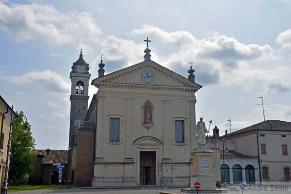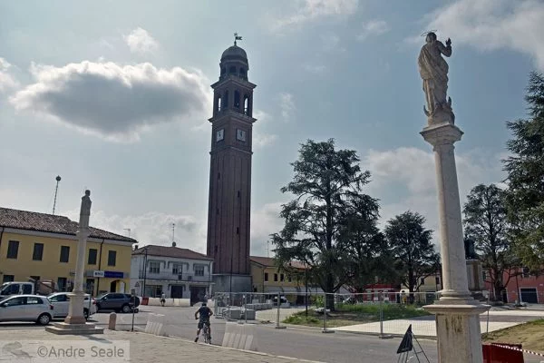 Com a garrafa de água gasosa cheia, fui então passear por Stienta, que é uma daquelas cidades pequenininhas da Itália, cheia de peculiaridades. A praça central estava em reforma. A igreja principal, danificada por um dos terremotos dos últimos anos, também estava em reforma.
