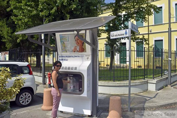 Estava numa esquina da praça central de Stienta, província de Rovigo. A máquina é basicamente um bebedouro na praça central da cidade. Nela, você coloca sua garrafa de água e enche, a módicos 5 centavos de euro por litro, com água gasosa – frizzante, na língua local.