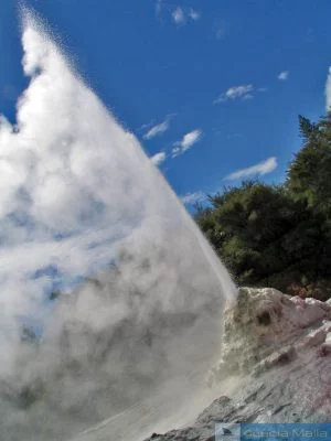 Gêiser Pohutu e gêiser Lady Knox, com seus respectivos terraços.