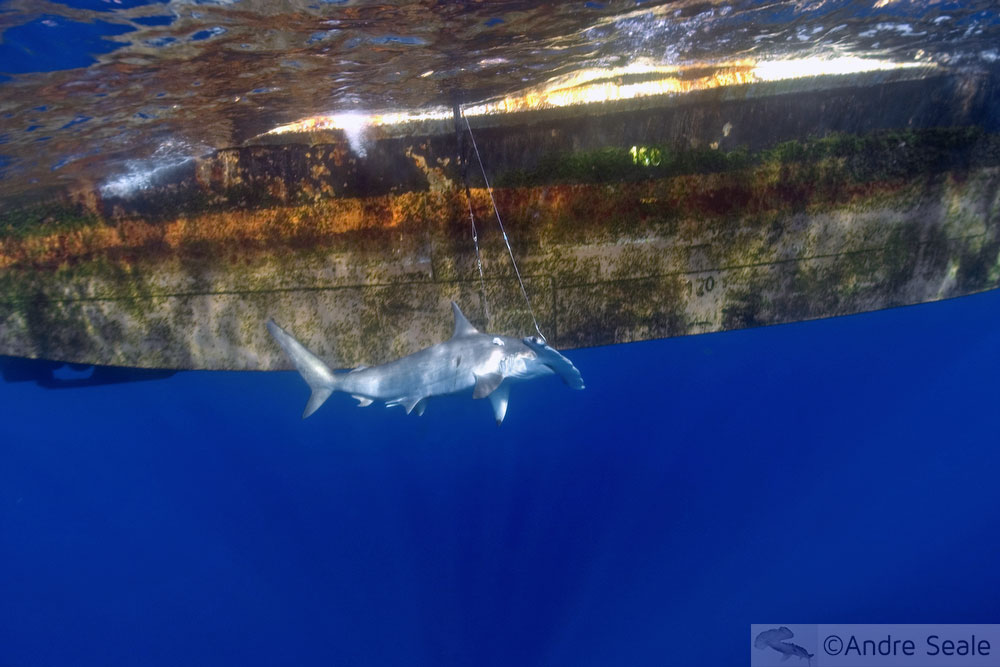 A foto acima tirada pelo André recebeu menção honrosa no Our World Underwater 2009, competição online organizada pelo Wetpixel.com e DivePhotoGuide que conta com a suprema honra da presença de David Doubilet entre os juízes. Como no ano passado, a menção honrosa foi na categoria Environment & Conservation (Ambiente & Conservação), desta vez com uma foto forte, de teor deprimente: um tubarão-martelo pescado ainda debaixo d’água, sob um barco de pesca. A foto foi tirada nas águas próximas ao Arquipélago de São Pedro e São Paulo e é reflexo da situação caótica em que a pesca de espécies marinhas, especialmente os tubarões, se encontram no Brasil e no mundo.