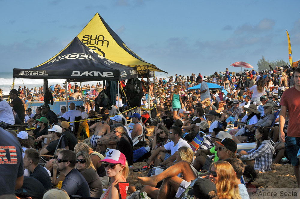 Para mim, que adoro surfe e ondas e praia, foi uma tarde inesquecível. Mais incrível ainda porque estávamos André e eu na companhia dos mais que queridos Mau & Oscar. Compensou muito acordar às 5 da matina e fazer o caminho mais ninja pro North Shore de Oahu para evitar o trânsito, aguentar o sol e o calor na areia com milhares de pessoas, rir muito da animação e viagem na maionese da galera (excelente oportunidade de people watching). Afinal o show e a festa do surfe na praia mais badalada do esporte foram simplesmente ALUCINANTES.