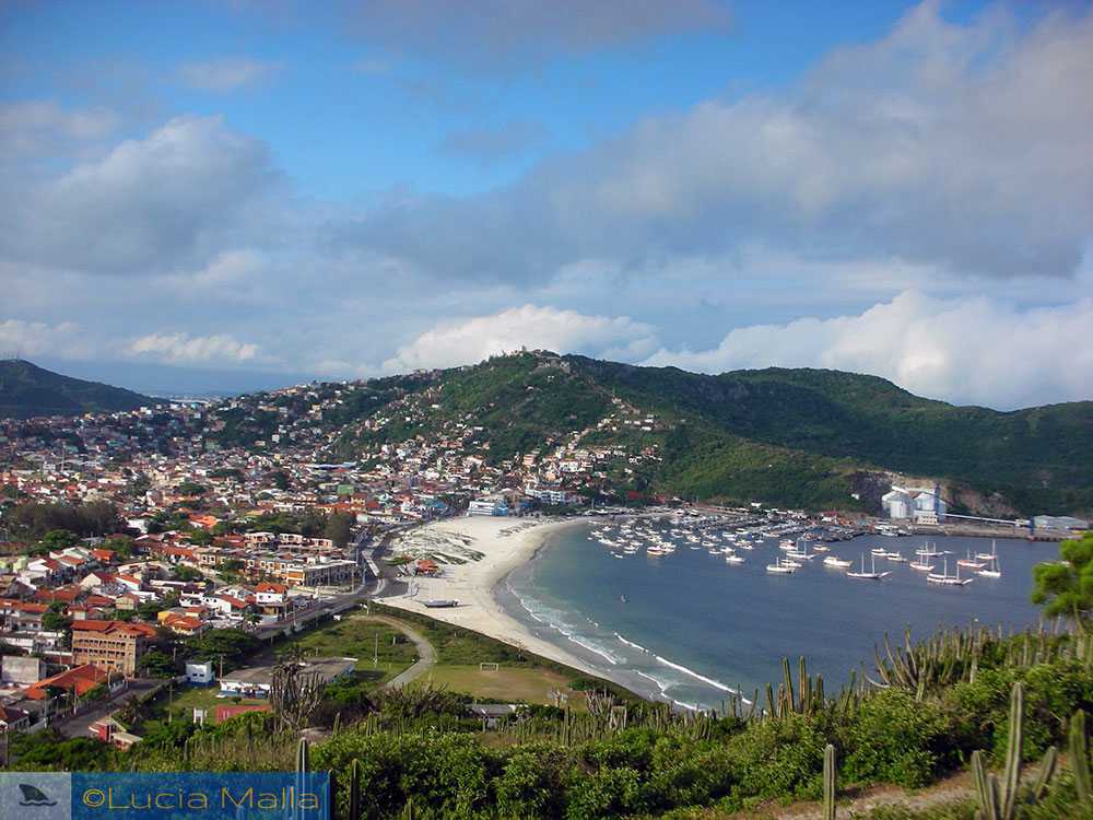 Eis que só a Luluzita acertou o desafio do post anterior. O João até chegou a conjecturar sobre, mas só a Luluzita disse (e com ar indeciso): Arraial do Cabo. A vista do outro lado do morro da foto é essa aí debaixo, uma vista aérea da cidadezinha – que apesar de pequena no nome de “arraial”, tem eletricidade às pampas e fica numa ponta do litoral do estado do Rio.
