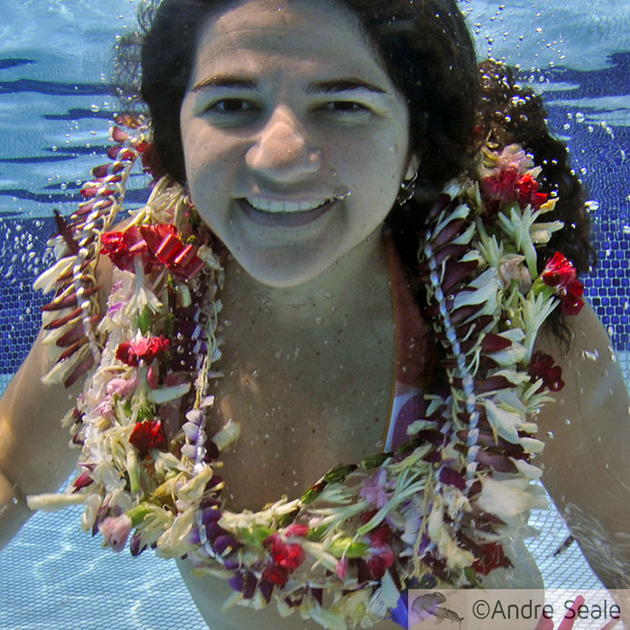 Amanhã é minha colação de grau de PhD. É tradição na Universidade do Havaí que os graduandos recebam um gazilhão de leis, os colares de flores super-cheirosos e delicados típicos das ilhas havaianas. Eu acho muito lindo. A Sexta Sub, então, já antecipa a festa! Entra, portanto, no ritmo de colação de grau havaiana, versão submersa na piscina e fazendo careta debaixo d’água. 😛