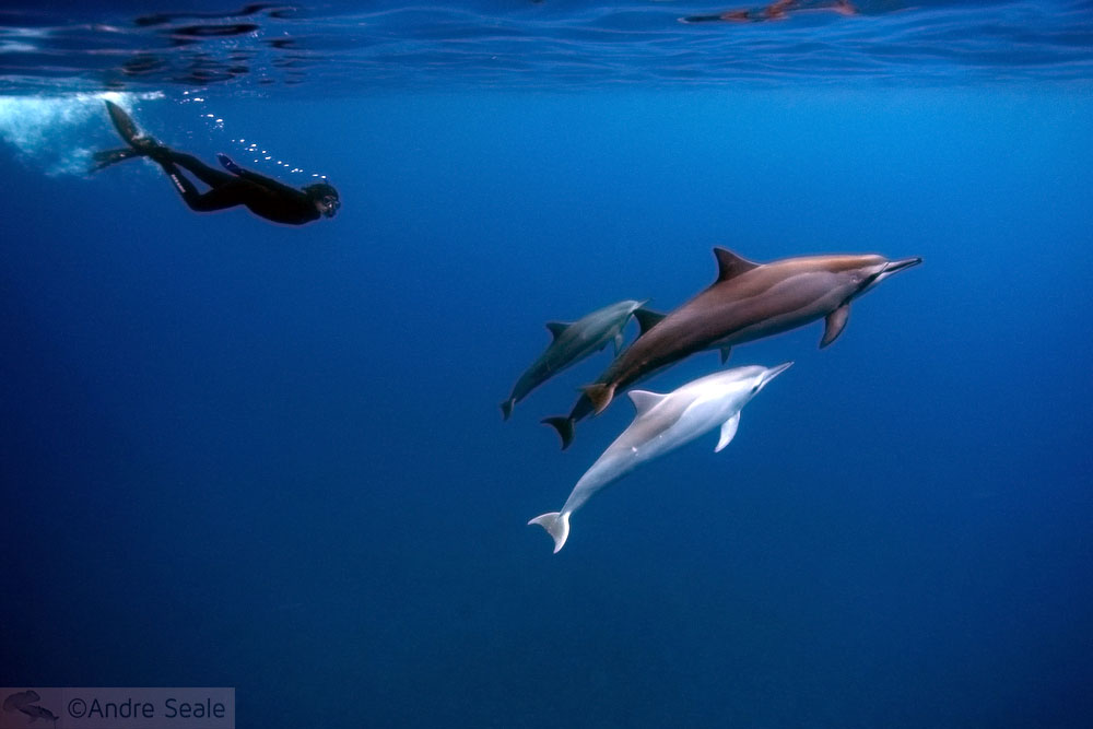A foto em si. Eis uma Malla snorkelando na baía de Kealakekua, Big Island do Havaí, em fevereiro de 2007, observando calmamente três golfinhos rotadores (Stenella longirostris) fofíssimos deslizarem pela água.