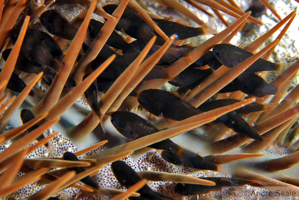 Na foto, o espinho da estrela coroa-de-espinhos que nos machuca e destrói os corais serve de proteção aos peixes-cardeais (Siphamia fuscolineata). A tristeza de um pode ser o bem-estar e a segurança do outro. Nunca sabemos.