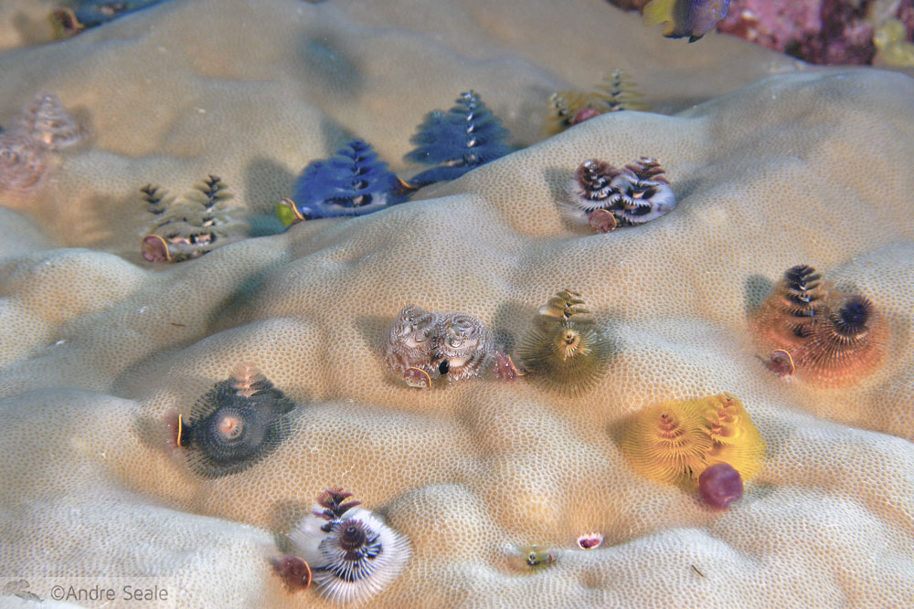 E as árvores… são vermes-de-árvore-de-natal marinhos (Christmas tree worms, em inglês; espécie Spirobranchus giganteus). Lindinhos e coloridos demais, uns fofos de se ver em qualquer mergulho.