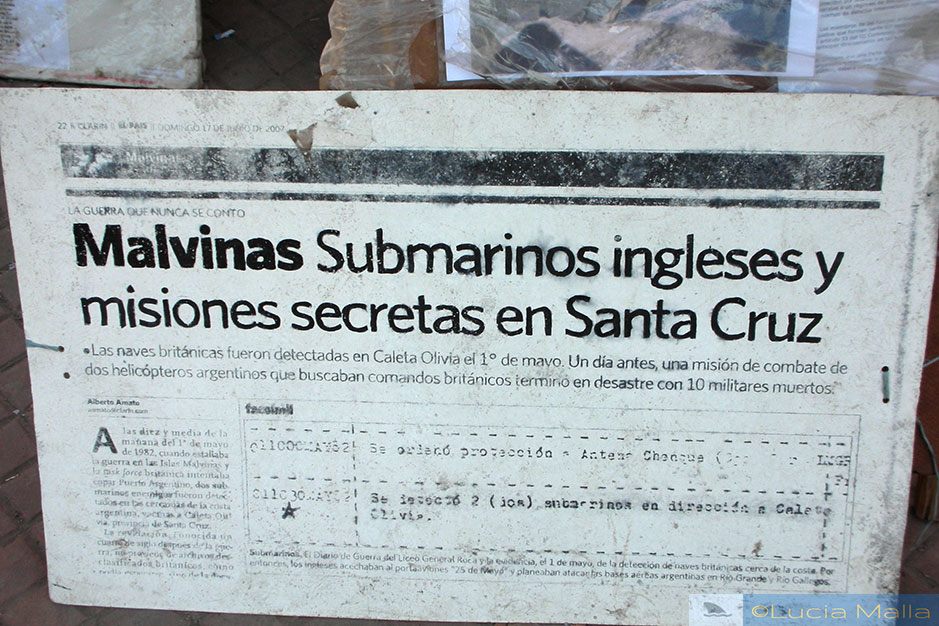 Cenas da Plaza de Mayo em 03 de abril de 2008, um dia depois do feriado das Malvinas. Muitas faixas, cartazes e folhetos ainda estavam pela praça, próximos à Casa Rosada – sinal de protestos que provavelmente se juntaram aos dos fazendeiros insatisfeitos com Kirchner. Na última foto, um recorte de jornal da época estampando a notícia de um possível plano britânico de expansão pelo continente argentino estava em andamento.
