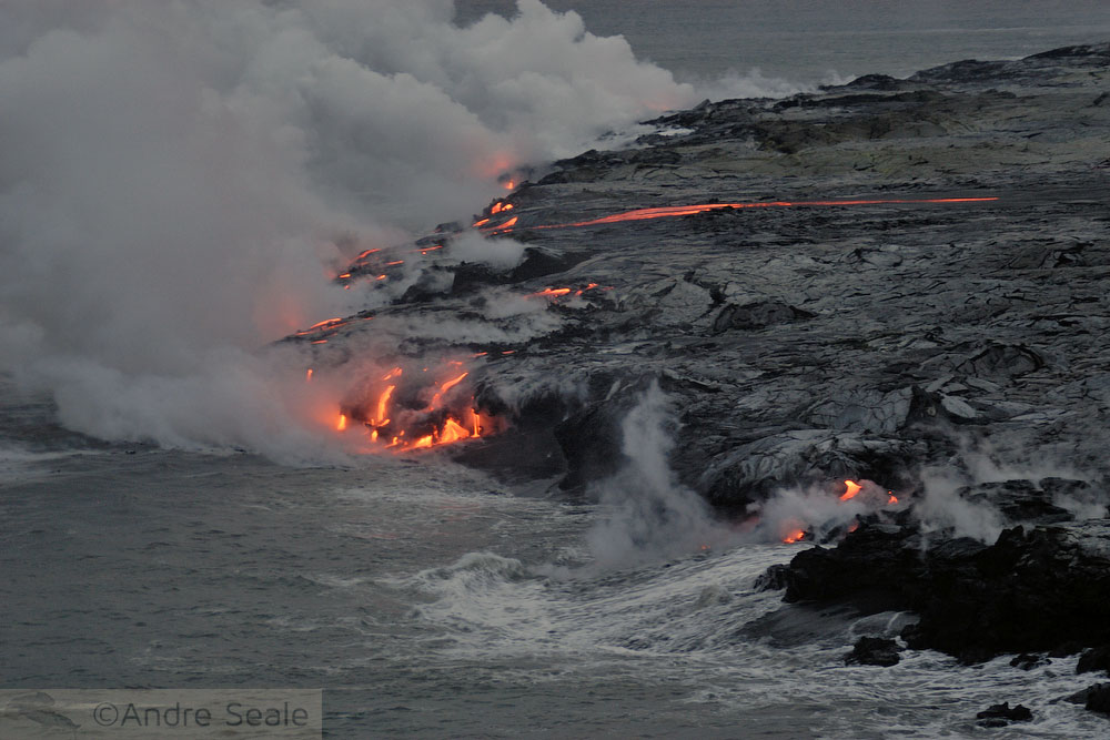 Mas o vulcão não pára de fazer mais ilha. E nesse dinamismo tectônico em grau máximo do nosso planetinha, mais ilha vai se formando, para repor a que se foi. Processo contínuo enquanto o Kilauea estiver ativo.